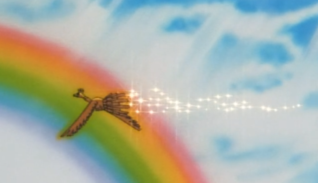 棚の上で、ホウオウが飛んで出迎えてくれています!